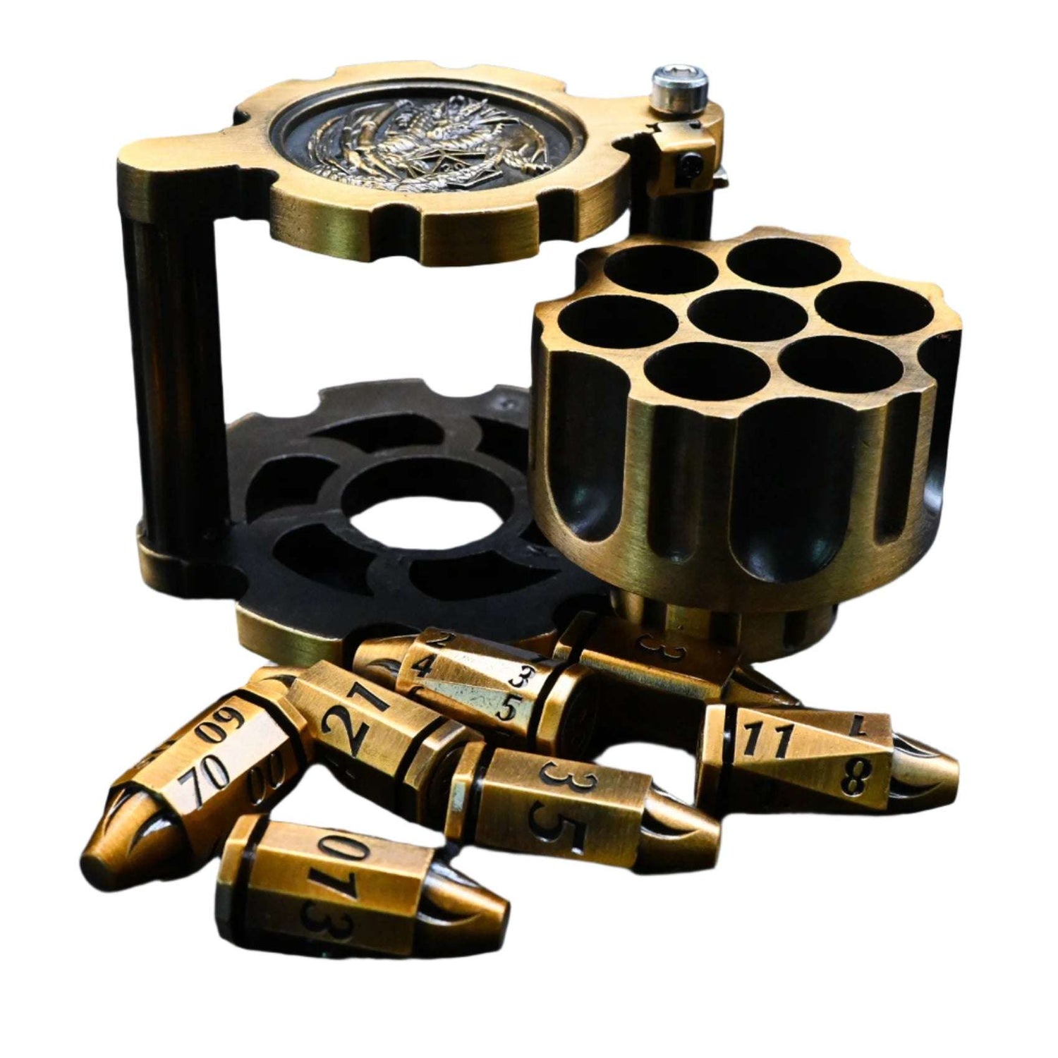 Forge your path with the Hexchamber Revolver Dice Set in Ancient Copper, solid metal bullet dice housed in a spinning chamber crowned with a dragon crest, crafted for gamers who appreciate style and precision.
