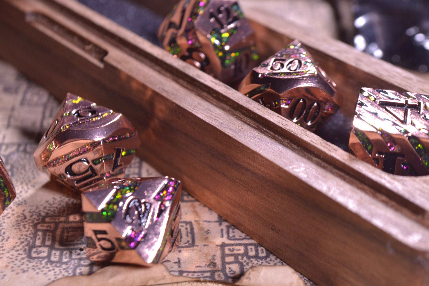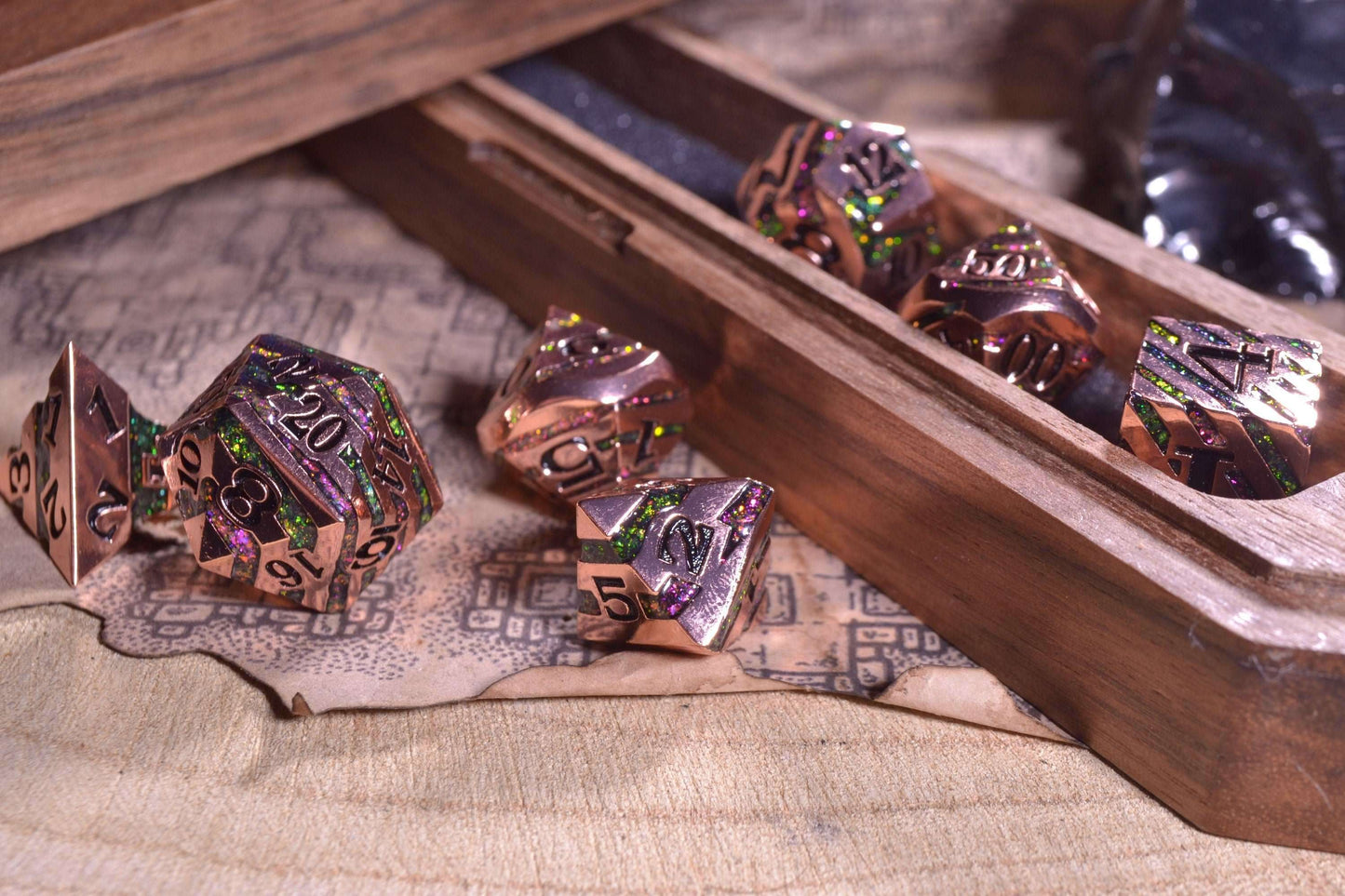 Each set of Solid Metal Dice comes in an attractive and robust box, tailored to protect the dice during transportation. This packaging is specifically designed to ensure that your dice remain secure and in perfect condition, ready to be taken to any location where your adventures unfold.