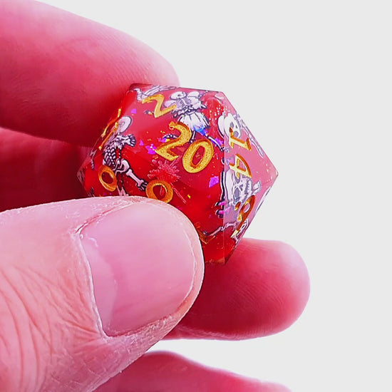 The Dance Macabre set turns the tabletop into a stage for something beautifully eerie. Each die has a solid red inner core wrapped in an outer layer of clear resin, giving depth and contrast to the dancing skeletons that adorn it. The figures seem suspended between layers, caught mid-step in an endless waltz. Gold numbering adds warmth to the design, shining like candlelight against the crimson core.