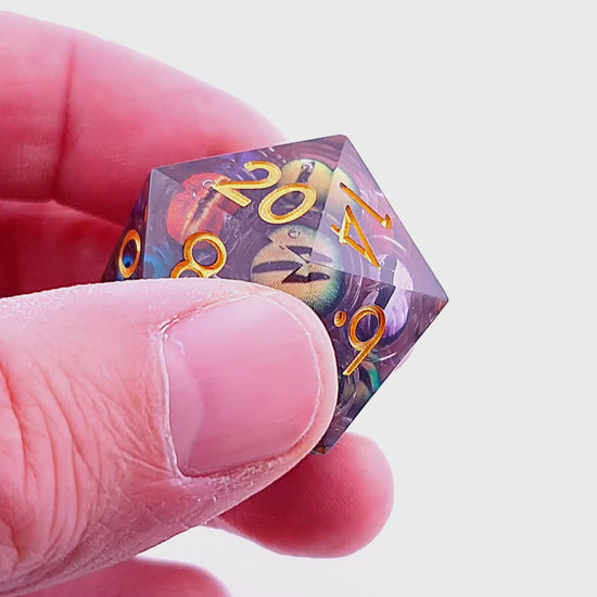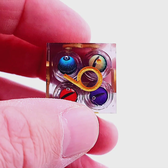 The Eyes of Chaos bring a strange and magnetic energy to your tabletop. Each oversized 30mm die is clear resin holding multiple eye orbs, each set inside its own small liquid chamber. The thin layer of liquid allows the eyes to glide smoothly, and when the dice come to rest, every eye turns upward, staring back with uncanny focus. It’s a presence that feels alive, unsettling, and impossible to ignore.