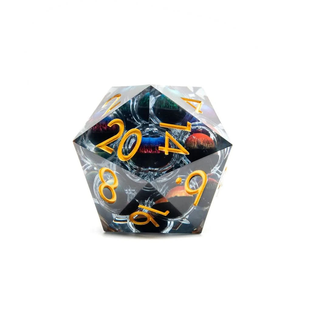 Inside each die lies a myriad of eyeballs, eerily suspended within a frictionless liquid core. As you roll the die, the eyes twist and turn, ultimately glaring ominously upward, watching and waiting. Perfectly themed for the dark and mystical realms of Dungeons and Dragons, this die adds a layer of intrigue and suspense to your gaming sessions.