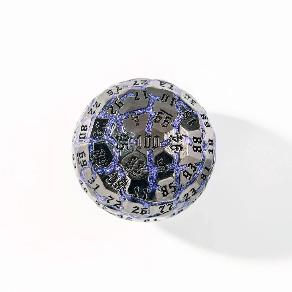 Unleash the power of your magical abilities with the Arcane Steel: 50mm Metal D100 in Black with Purple Mica Cracks, a dice that not only aids in your mystical quests but also elevates the arcane ambiance of your Dungeons and Dragons gameplay.